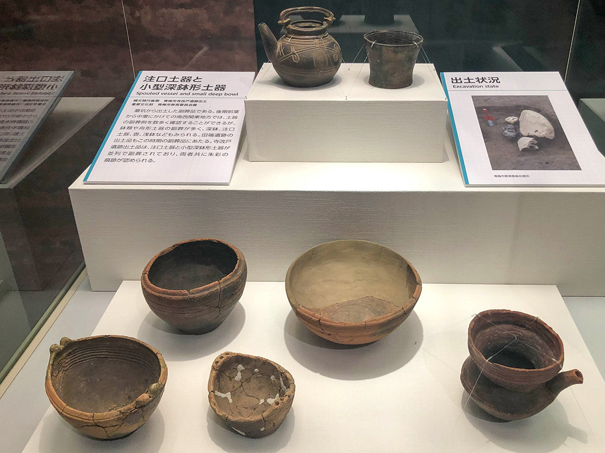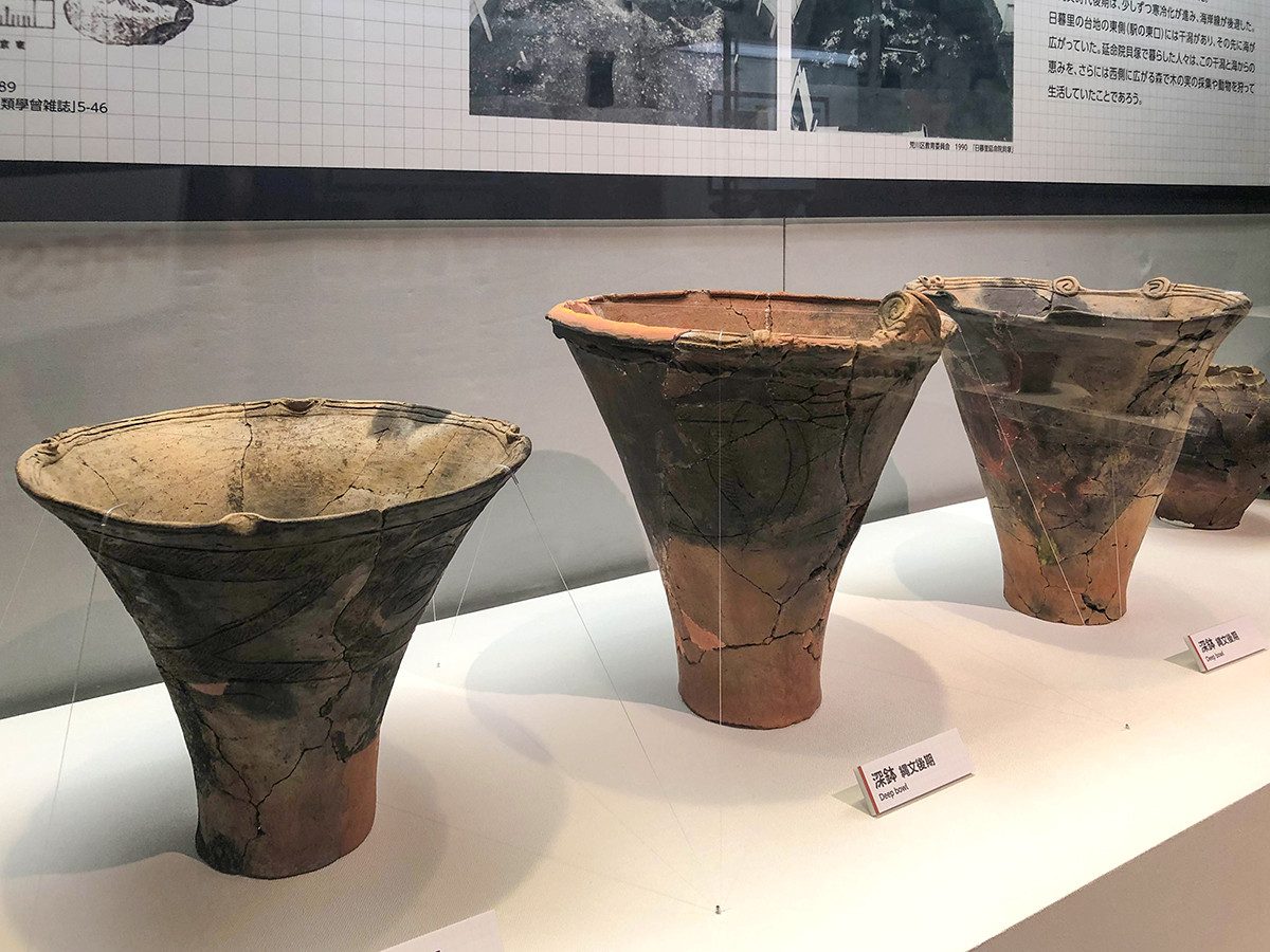 草創期では、器を完成させるために試行錯誤を繰り返しますが、前期になると文様を付けて変化に富みます。また、中期には大型化が進み、後期~晩期になると日用と特別用と用途を多様化するなど、石器や土器から移り変わりを感じることのできる展示になっています。