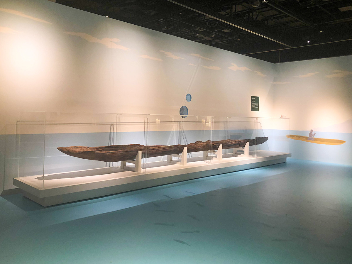 先ず紹介するのは海岸部の遺跡、直径が70センチを超えるムクノキからつくられた丸木舟です。現存の長さが約5.8メートルに及ぶ丸木舟は、船底の厚さや内部の深さから、制作技術の発達もうかがうことができます。