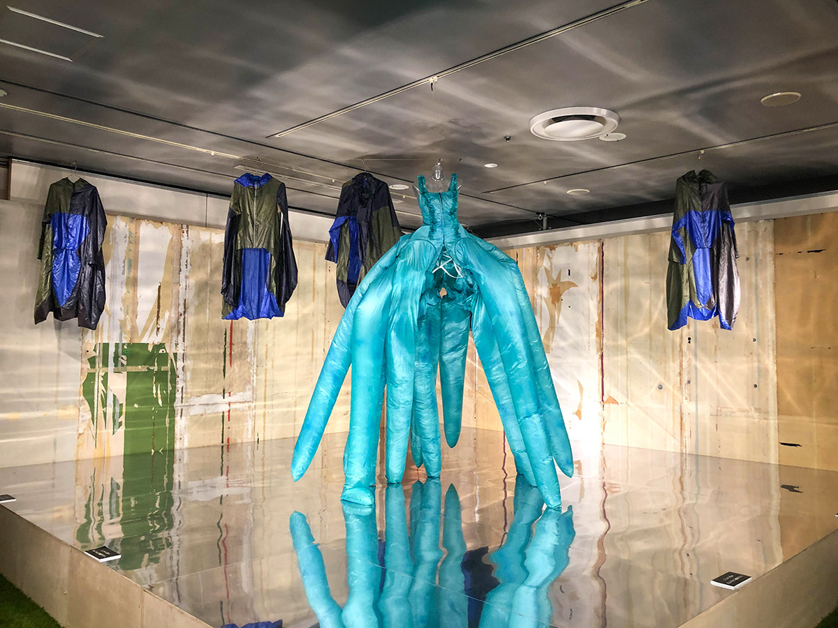 “試着の森”に現れるのは、大きな青いドレス。ヘリウムが入った服は、衣装を着て体験すること想定して作られた洋服たちです。コロナの状況で残念ながら試着はできませんが、空へ飛んでいく姿を想像しながら楽しむことができます。