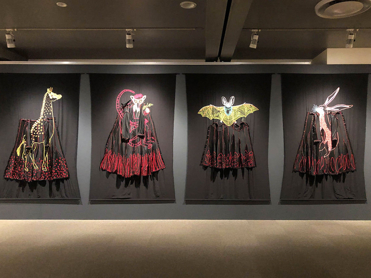 演劇や映画、テレビでも使用される衣装など、様々な作品を手がけてきたひびの。展覧会では、その一部になりますが、世界観に浸ることができる空間が広がっています。