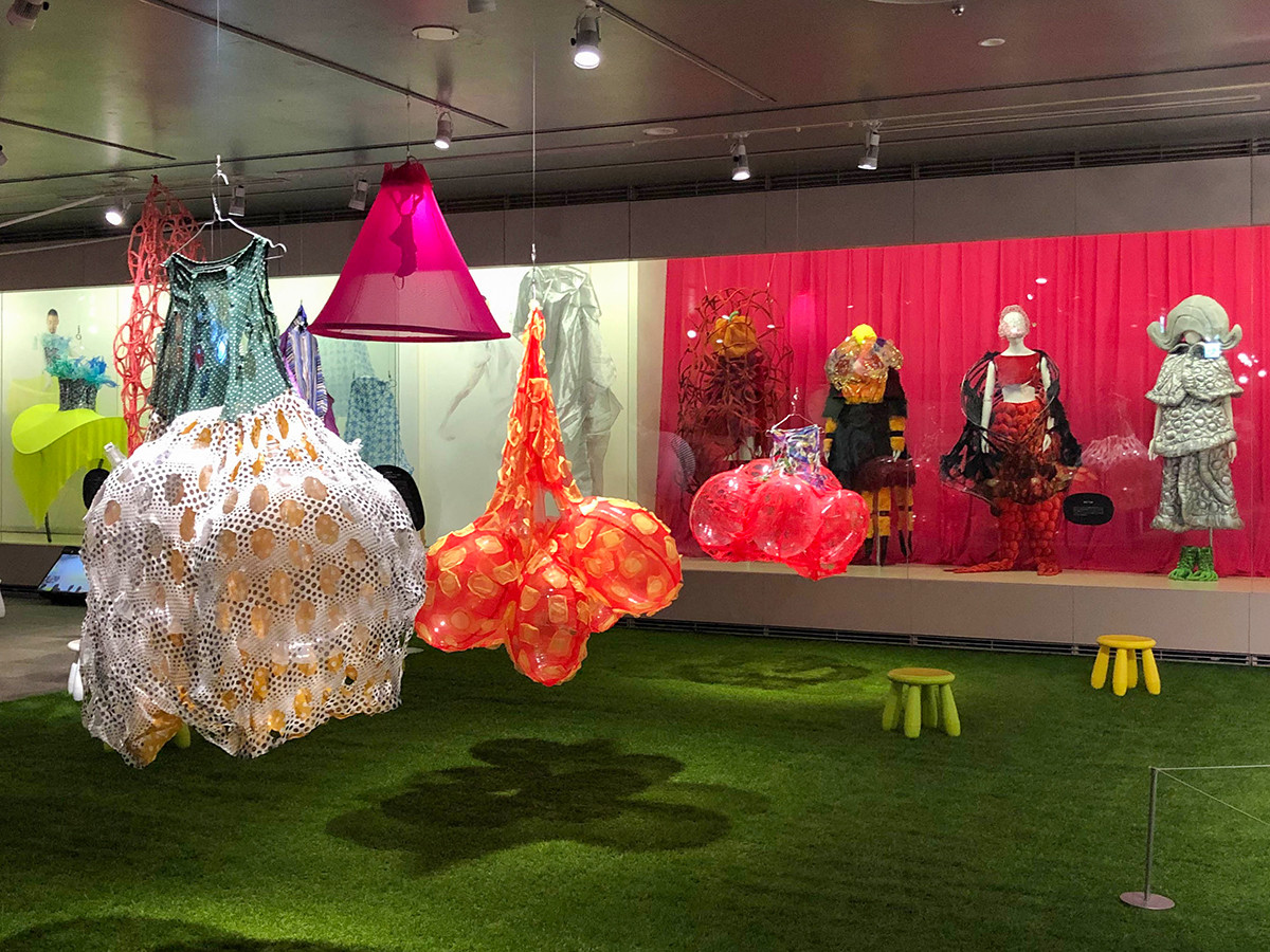大きなカエルのバルーンに出迎えられて会場入口を通ると、“巨大な生き物の森”に入っていきます。展覧会タイトル「森に棲む服」の通り、森の中で様々な洋服に出会う会場になっています。