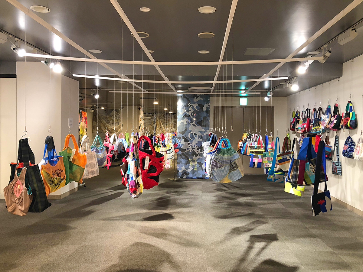 会場の最後に飾られているのは“バックの森”。衣装を作った際の残った生地や解体してできたバックは、購入も可能です。通常、美術館はギャラリーと違い作品の販売は行っていません。しかし、展覧会は見るだけでなく感じて触れてもらいたい、という思いが実現したそうで、肩にかけて鏡で見ながら吟味することができます。