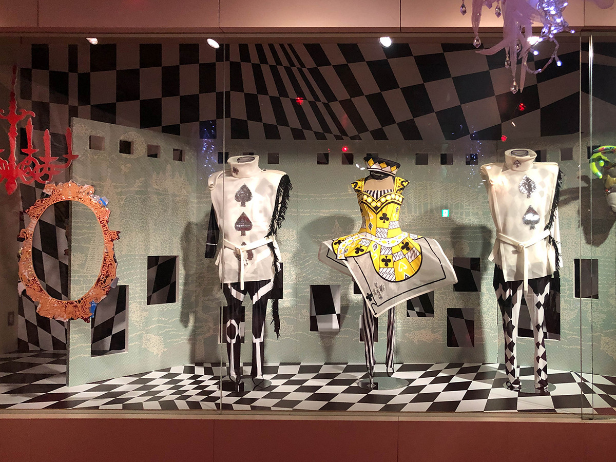 印象に残った作品は、2017年の舞台「不思議の国のアリス」の衣装です。主人公のアリスや宙を回転する女王、チェシャ猫やトランプ兵などキャラクターの衣装だけでなく、カーペットの色や鏡の装飾からも物語を感じさせる不思議な空間です。
