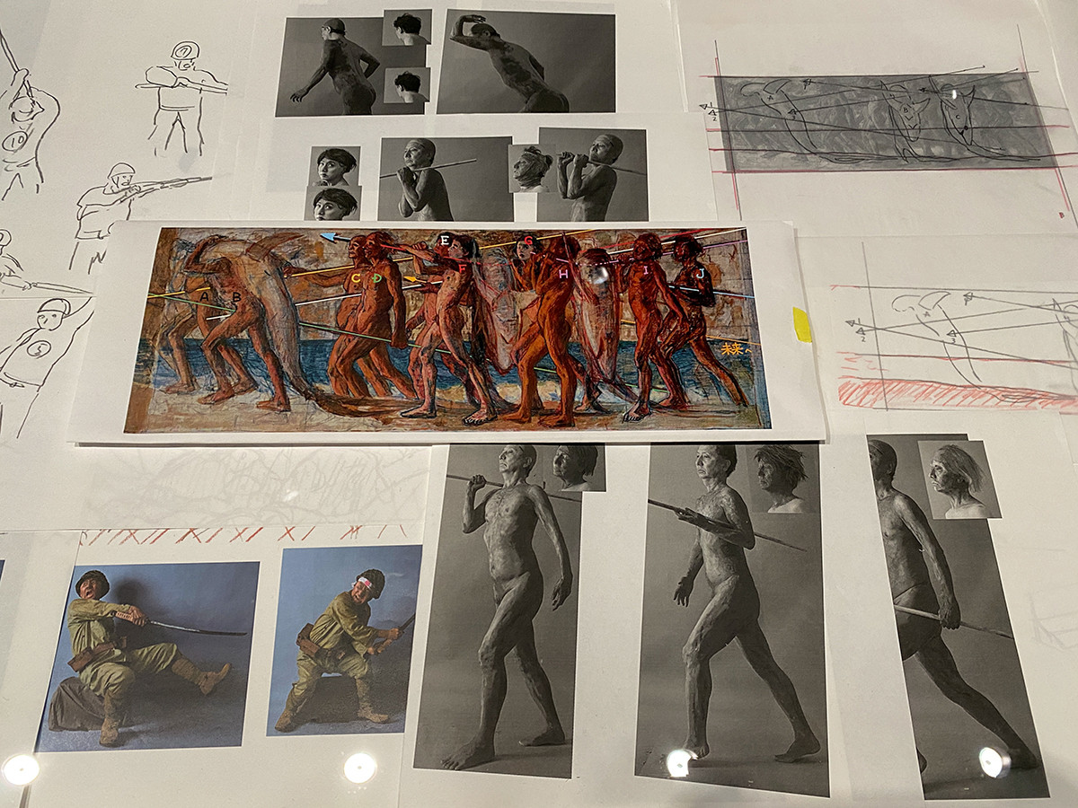 展示ケースにはスケッチやメモ類も。細かな指示で、創作のプロセスを感じることができます。