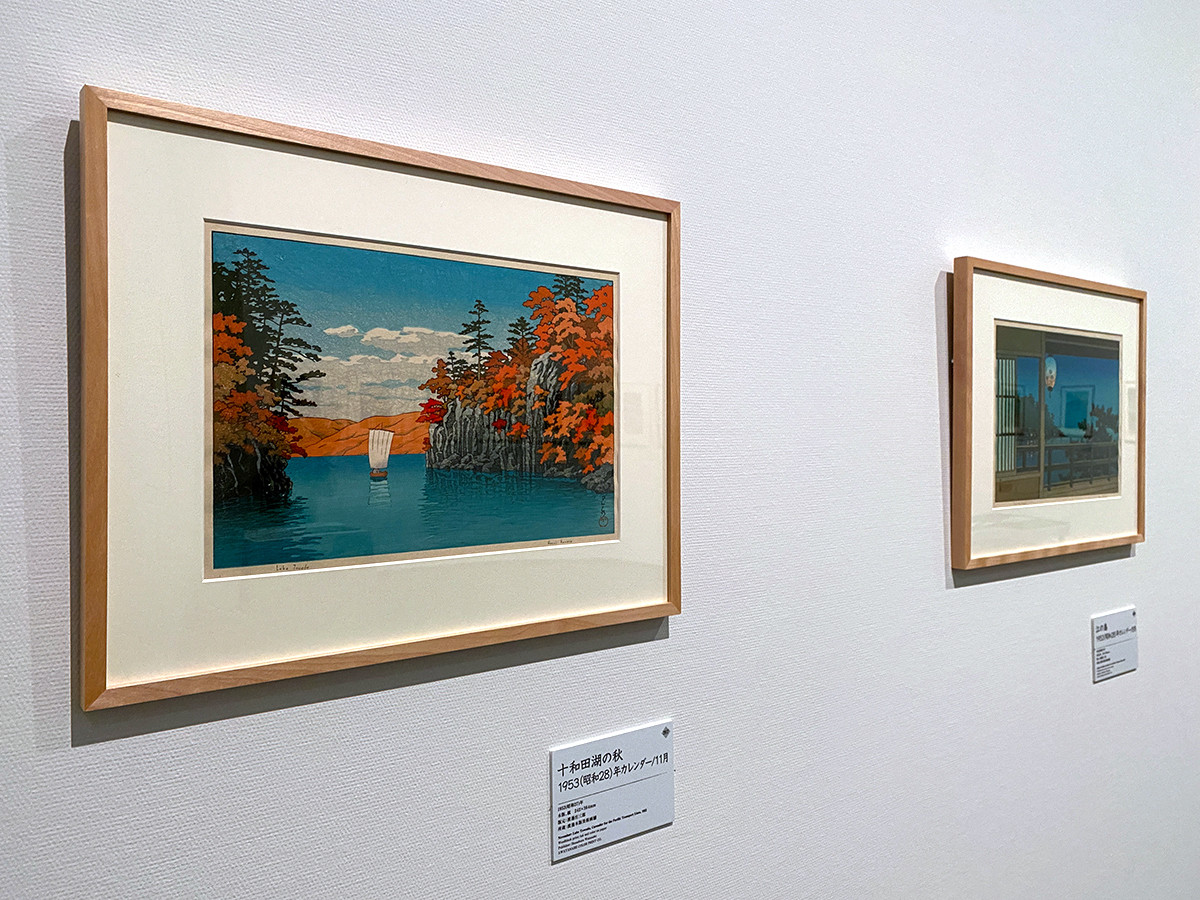 (左手前から)川瀬巴水《十和田湖の秋 1953(昭和28)年カレンダー/11月》 / 川瀬巴水《江の島 1953(昭和28)年カレンダー/8月》 ともに パシフィック・トランスポート・ライン社注文制作作品 1953(昭和28)年カレンダー 木版、紙 渡邊木版美術画舗