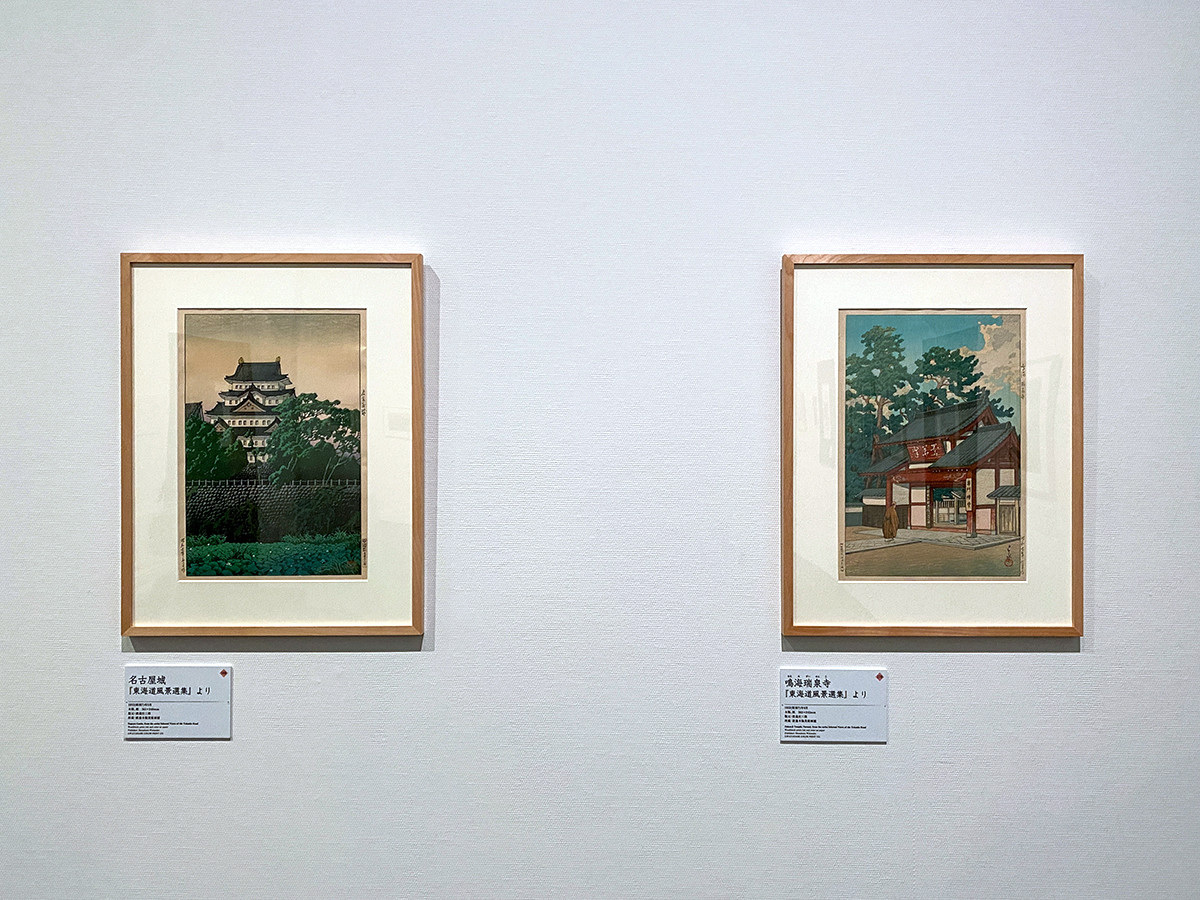 (左から)川瀬巴水《名古屋城》東海道風景選集 1932(昭和7)年5月 / 川瀬巴水《鳴海瑞泉寺》東海道風景選集 1932(昭和7)年6月 ともに木版、紙 渡邊木版美術画舗[※前期のみ出品]
