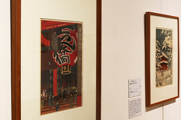 (左から)《浅草観音堂大提灯》笠松紫浪 1934年 山梨県立美術館 / 《東京風景 増上寺の雪》土屋光逸 1933年 個人蔵