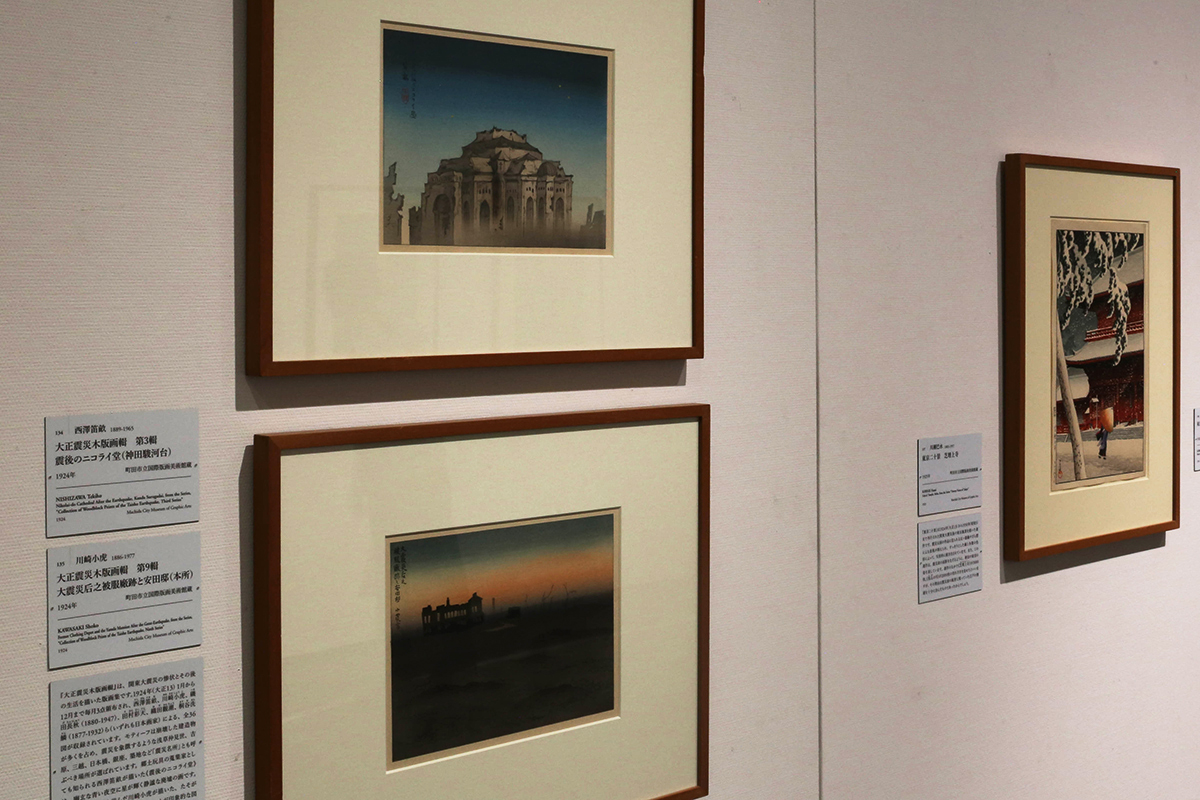 (左上)《大正震災木版画輯 第3輯 震後のニコライ堂(神田駿河台)》西澤笛畝 1924年 / (左下)《大正震災木版画輯 第9輯 大震災后之被服廠跡 安田邸(本所)》川崎小虎 1924年 / (右)《東京二十景 芝増上寺》川瀬巴水 1925年 いずれも町田市立国際版画美術館蔵