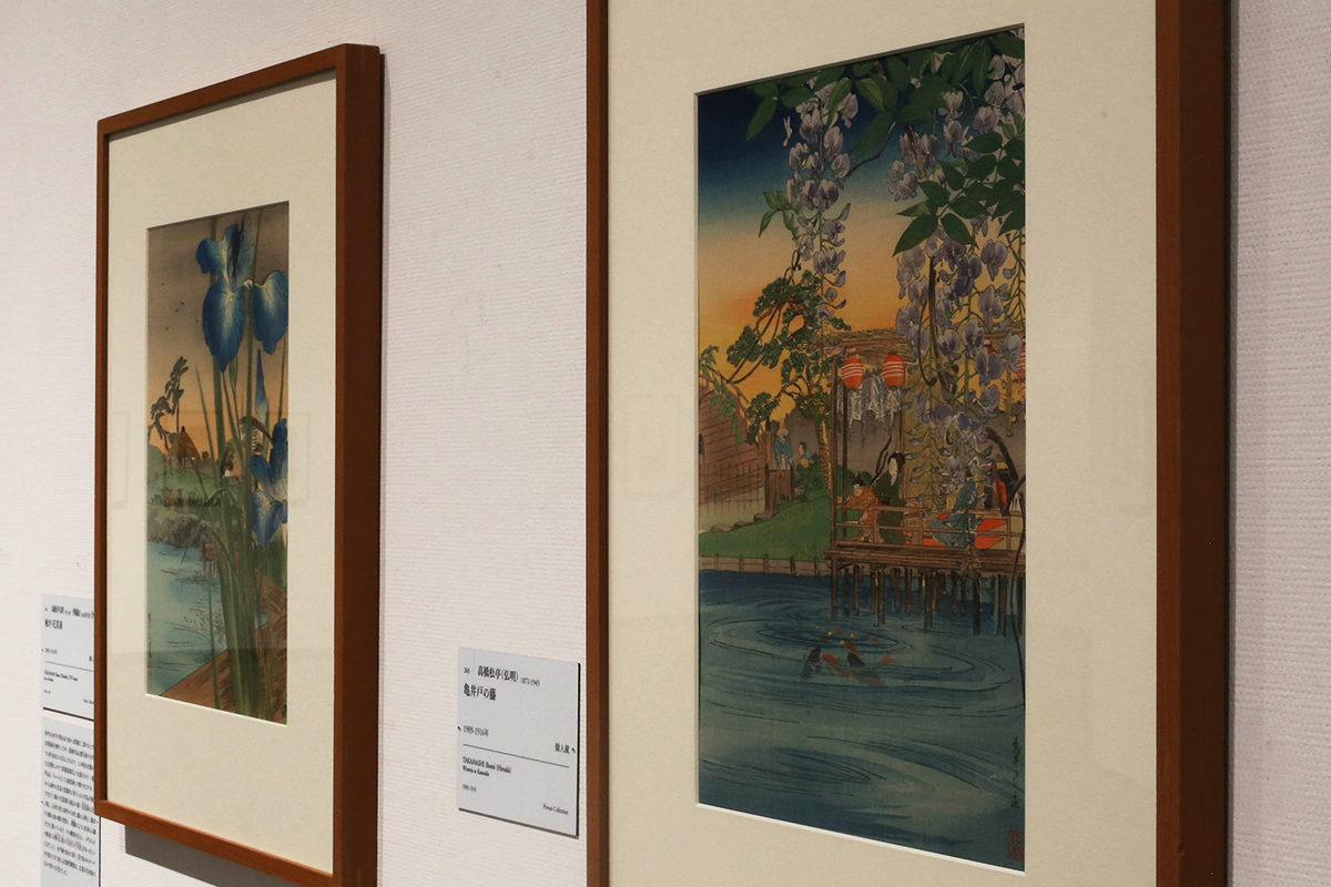 (左から)《堀きり花菖蒲》高橋松亭(弘明)・伊藤総山〈合作〉 1909-16年 個人蔵 / 《亀井戸の藤》高橋松亭(弘明) 1909-16年 個人蔵