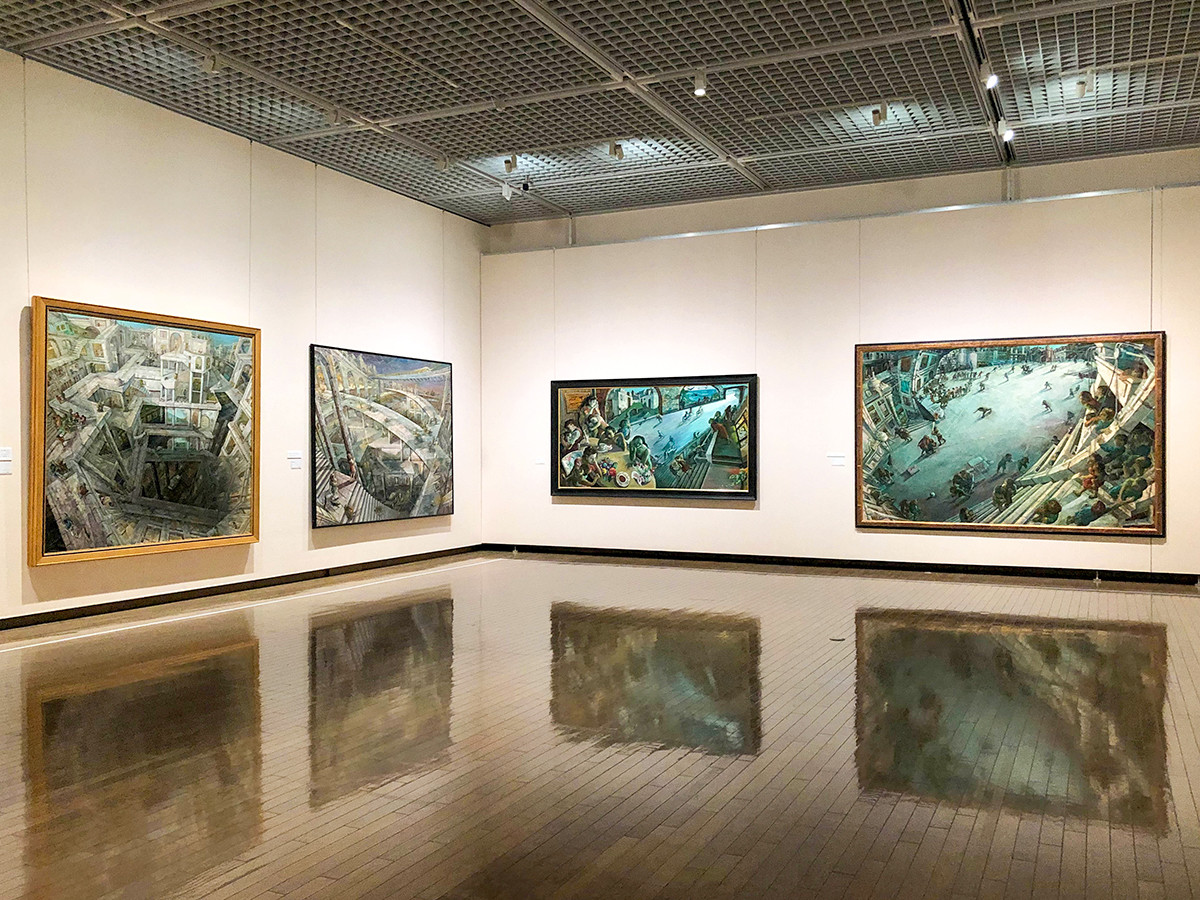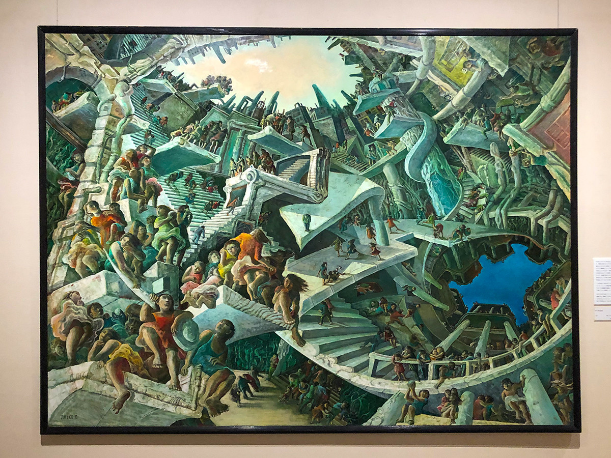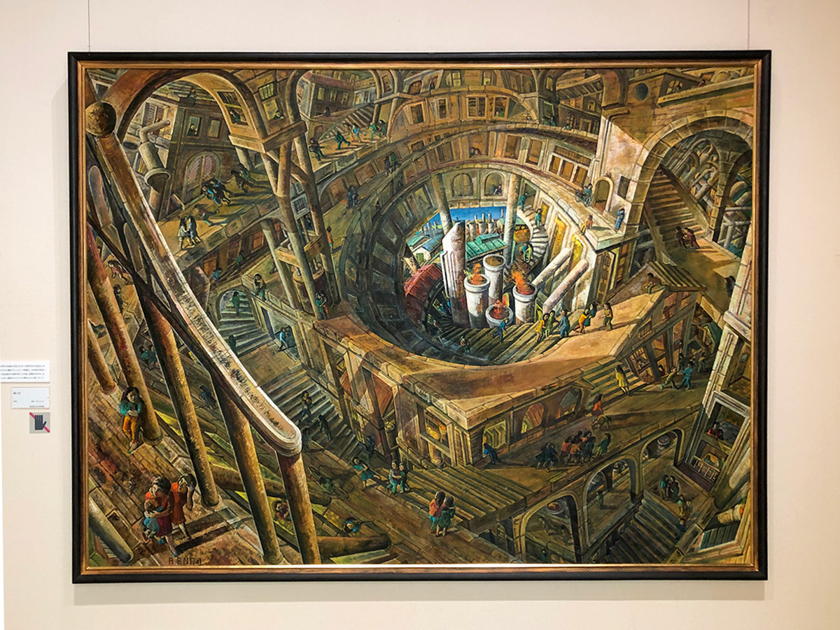 10年近く描かれた「街シリーズ」の集大成と言える作品が、安井賞を受賞した《遠い日》です。 マウリッツ・エッシャー のような螺旋の構図に、自転車に乗る人や遊んでいる子どもたちなど、都会に生きる人々の不安感が表現されています。