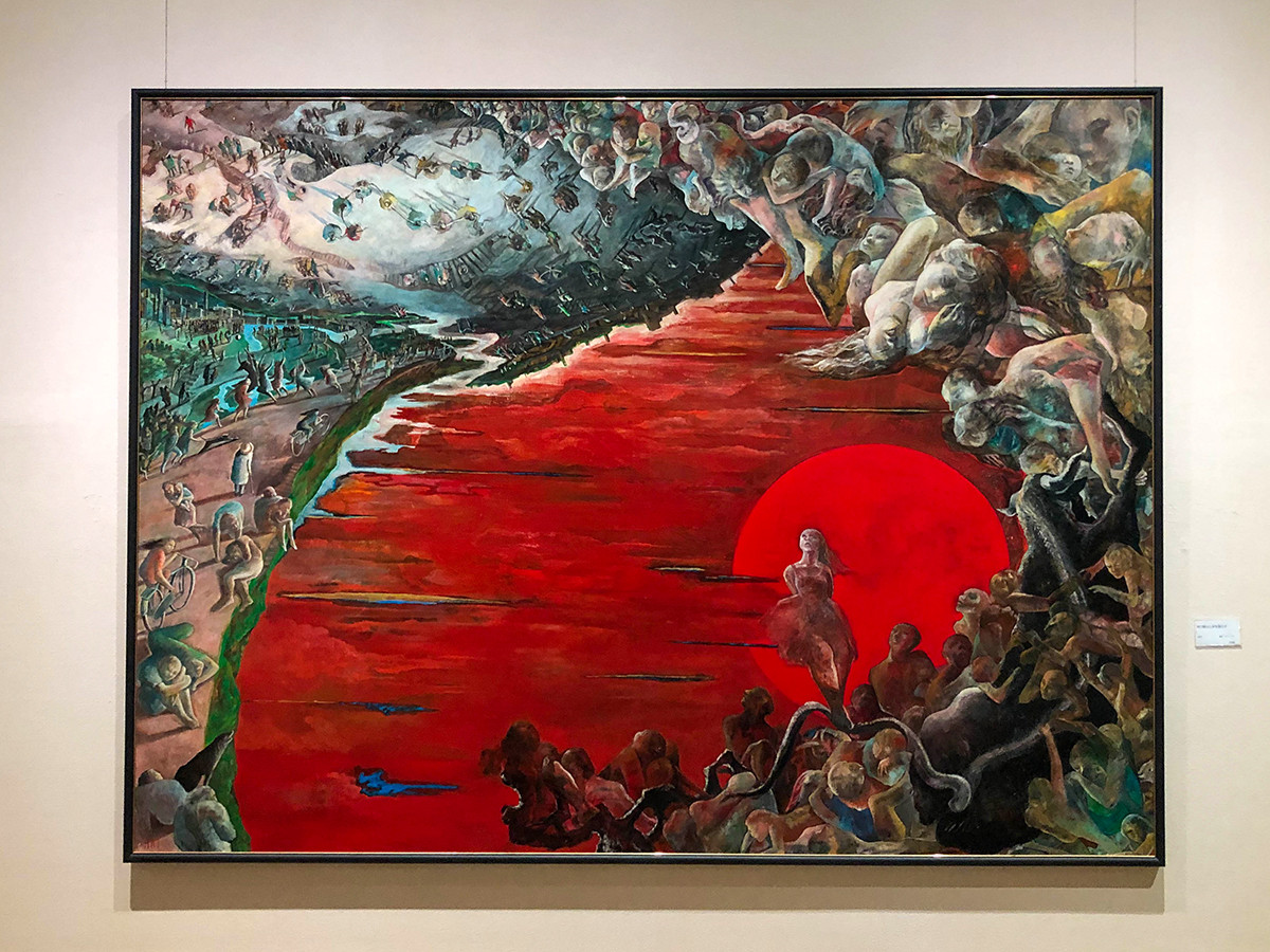 作品には、食事をしていたり、寝ていたり、様々な場面に作者自身が登場します。リアルな現実と作品の中に入り込んだ自身が存在し、その当時の社会や心境が画面に映し出されています。