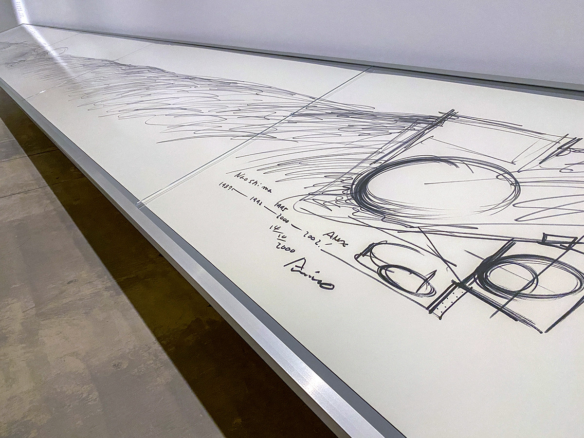 ひときわ目をひく長さ10mのドローイングは、上海ビエンナーレ(2000年開催)で制作された《ベネッセハウス-直島コンテンポラリーアートミュージアム》。日本初公開です。