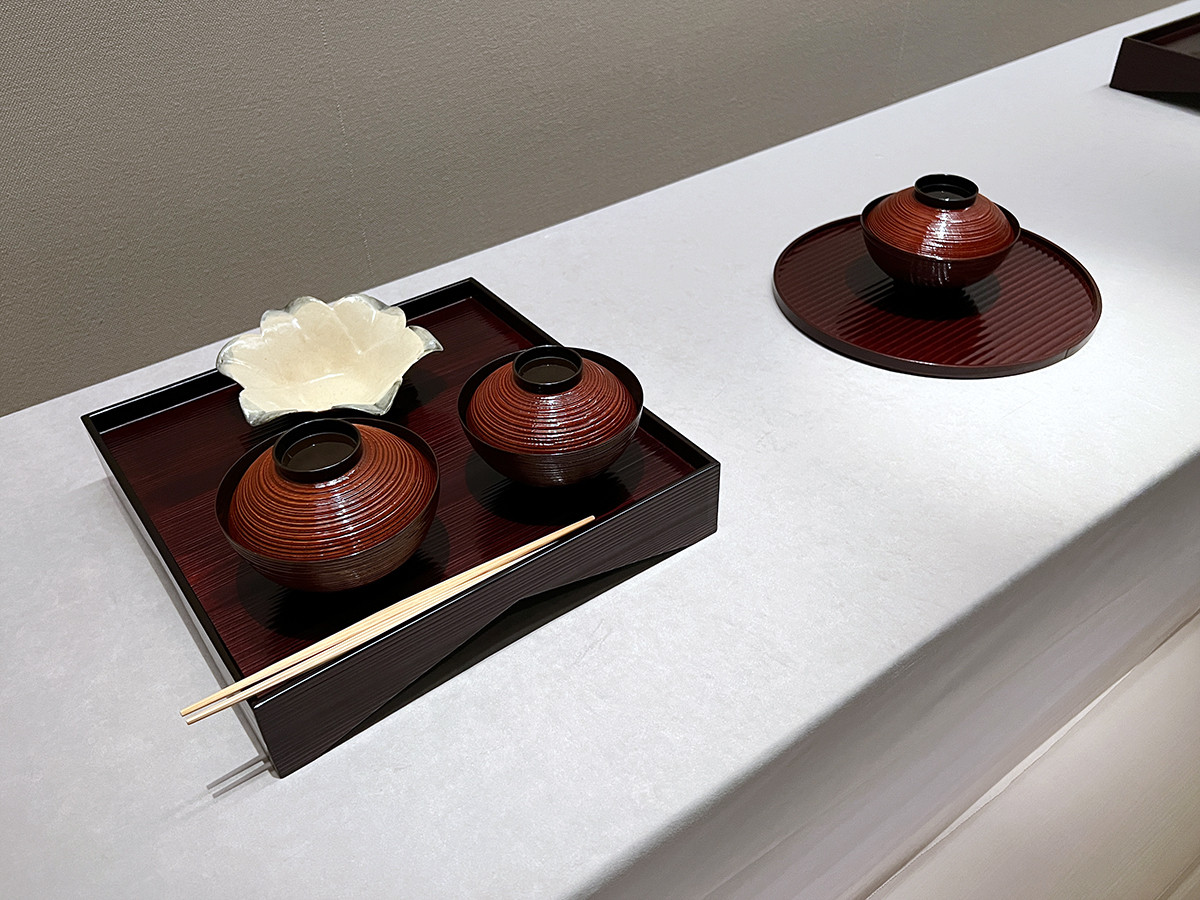 《糸目溜塗汁椀・飯椀・煮物椀》渡邉喜三郎作 日本・大正~昭和時代 20世紀 根津美術館 / 《鉋目溜塗膳》渡邉喜三郎作 日本・大正~昭和時代 20世紀 根津美術館