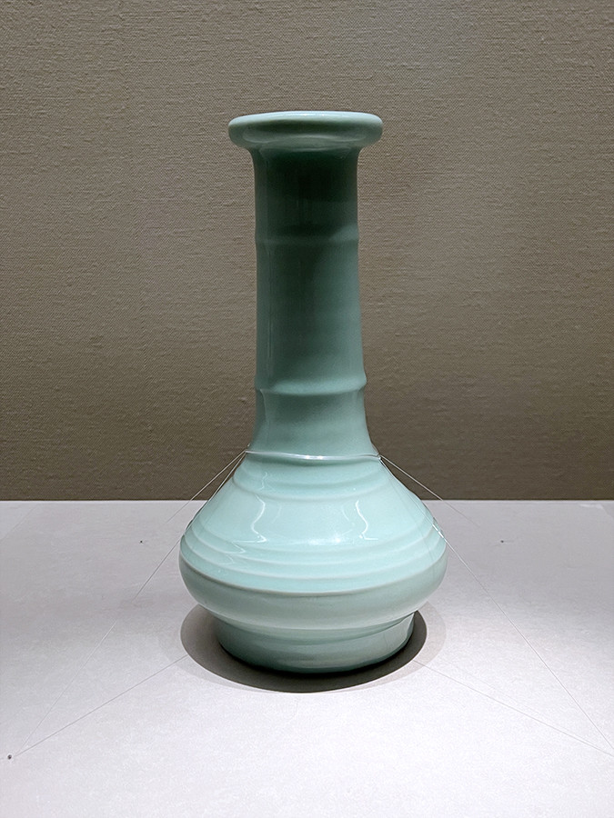 頸部と胴部に入った凸状の条線を、竹の子の節に見立てた竹子(筍、笋)花入。展示されている作品は、バランスの良さと釉薬の美しさから、日本伝来の竹子花入では屈指の優品とされています。