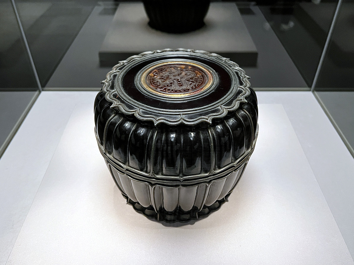 《黒漆稜花形盒子》も、典型的な稜花形の器です。力強く、稜線にも金属が伏されており、シャープな印象を受ける作品です。