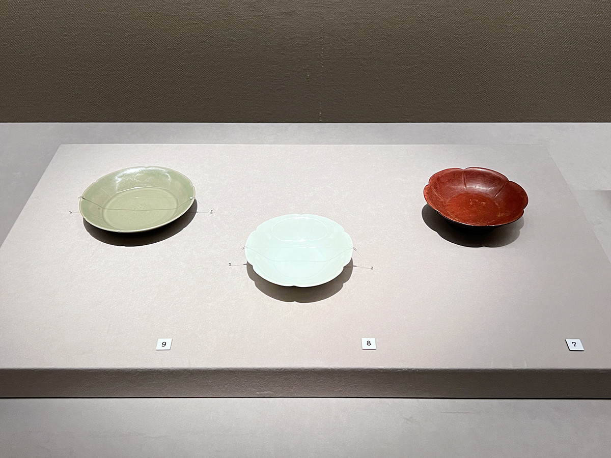 (左から)《青磁輪花皿》耀州窯 中国・北宋時代 11世紀 個人蔵 / 《青白磁輪花皿》景徳鎮窯 中国・北宋時代 11~12世紀 個人蔵 / 《朱漆輪花皿》中国・北宋時代 10~12世紀 永田牧子氏寄贈 根津美術館