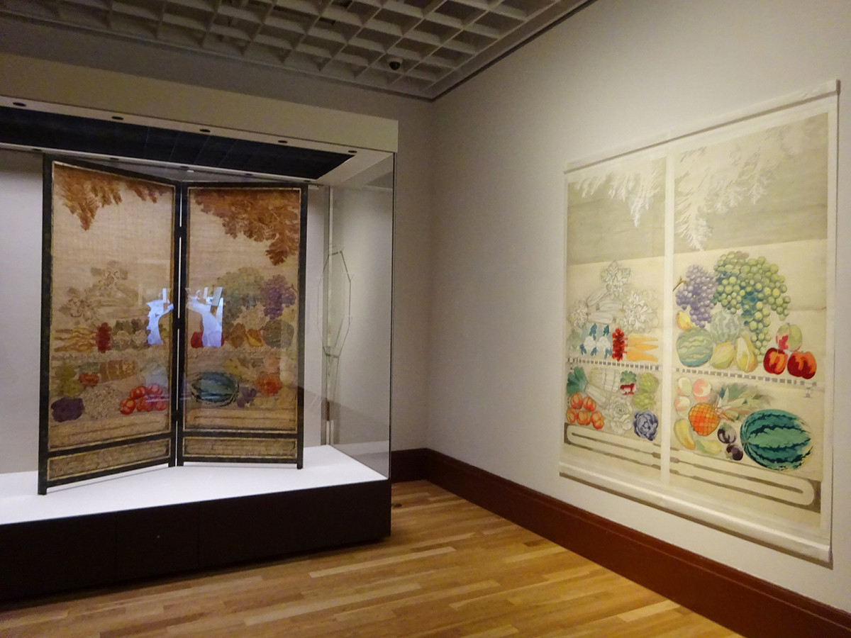 山鹿清華(2点とも)《透明手織錦屏風 冷蔵果》 1932年 京都国立近代美術館蔵 (左) 《透明手織錦屏風 冷蔵果(織下絵)》 1932年 京都市美術館蔵(右)(ひろいのぶこさんの部屋)