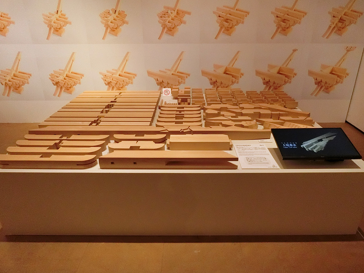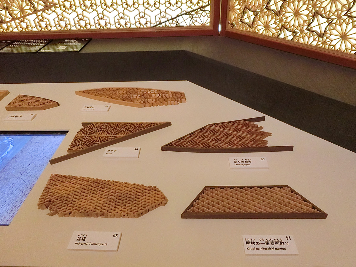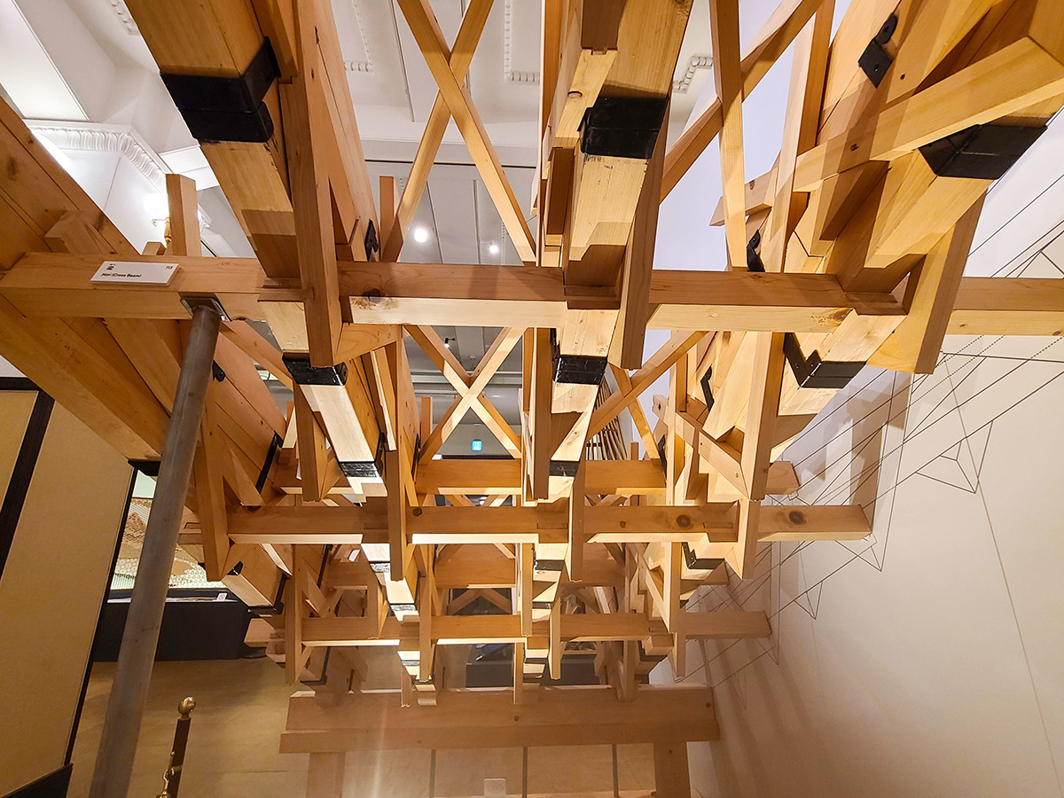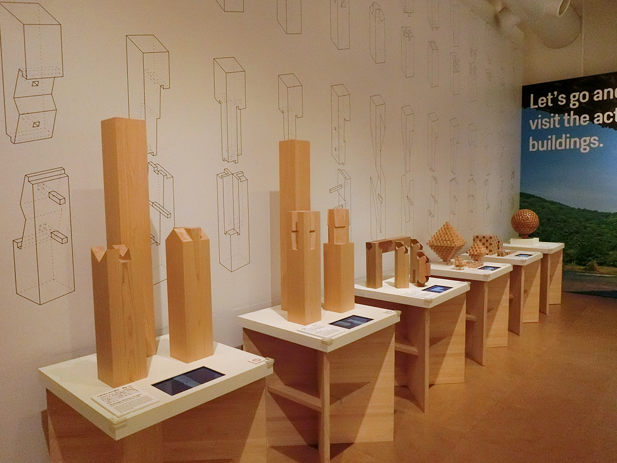 立体パズルのような木組が展示されています。壁面に図解が示されていますが、見比べても想像ができない複雑さです。この構造を考え出し、それを形にしてピッタリと合わせる技術。それによって強度が生まれ支えられ、美しさも生みだしました。