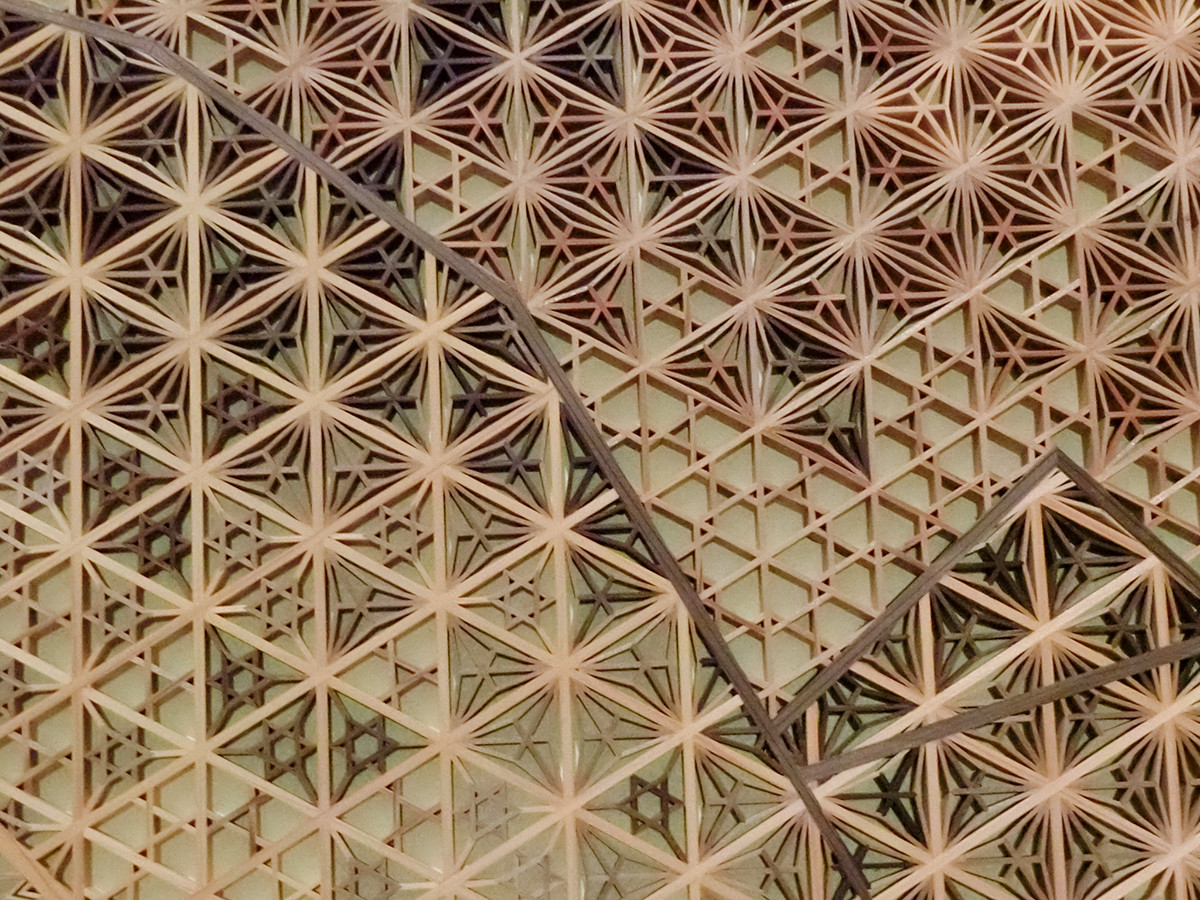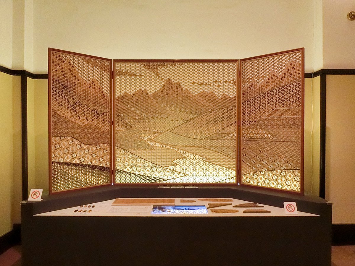 細くて薄い木材を精密に加工し、様々な幾何学模様を構成する高度な技術にため息がでます。発祥は鎌倉時代と言われ、この屏風はこの展覧会のために制作されました。