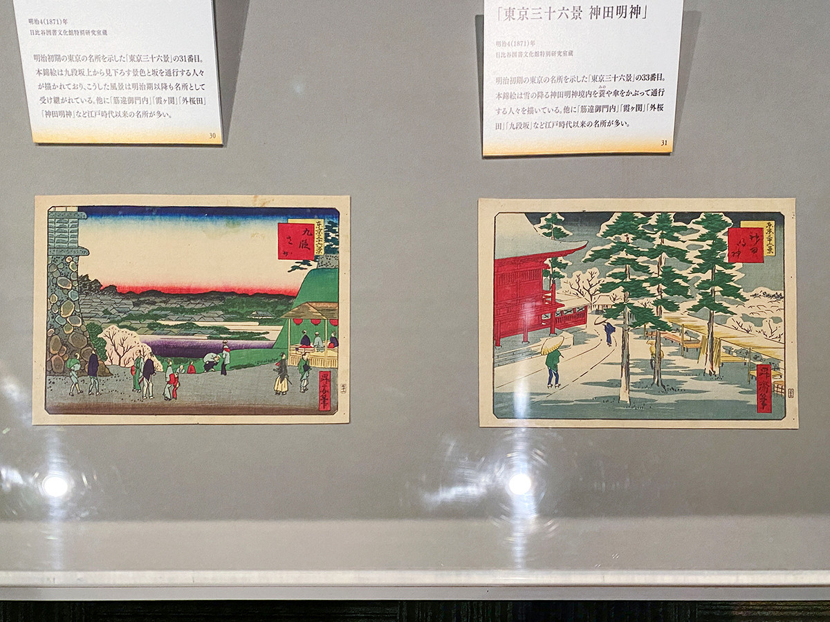 (左から)「東京三十六景 九段さか」 / 「東京三十六景 神田明神」 ともに 明治4(1871)年 日比谷図書文化館特別研究室蔵