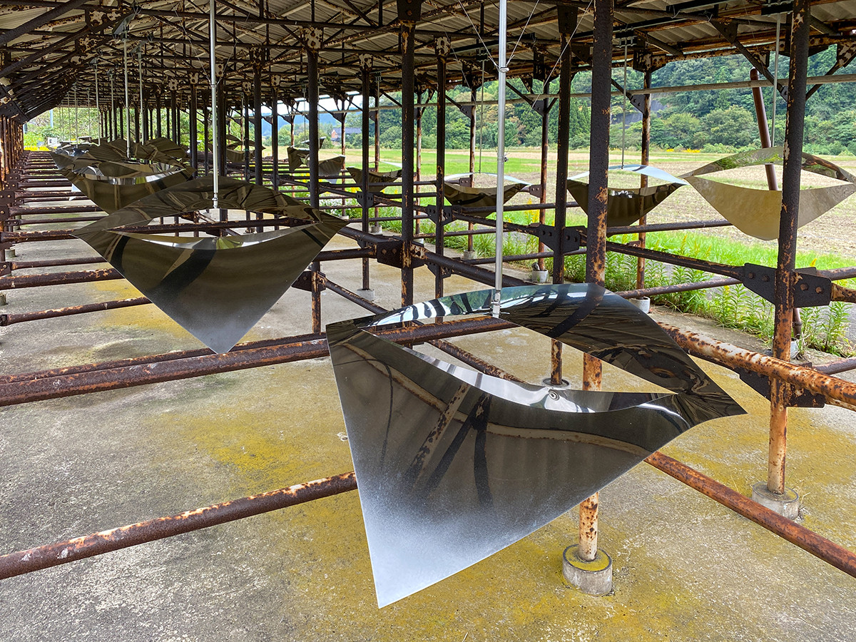続いて、旧小学校のグラウンドに吊り下げられた、切り込みを入れたステンレスの鏡面板。鏡面には周辺の景色が映り込み、不思議な風景が宙に浮かびます。
