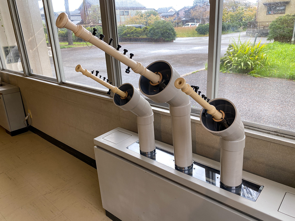こちらは、数年前まで使われていた旧図書館に設置された作品。空っぽの本棚が残る室内に入ると、楽器の音が聞こえてきます。既存の空調設備を利用し、排出される風で、リコーダーやハーモニカを鳴らす仕組みです。