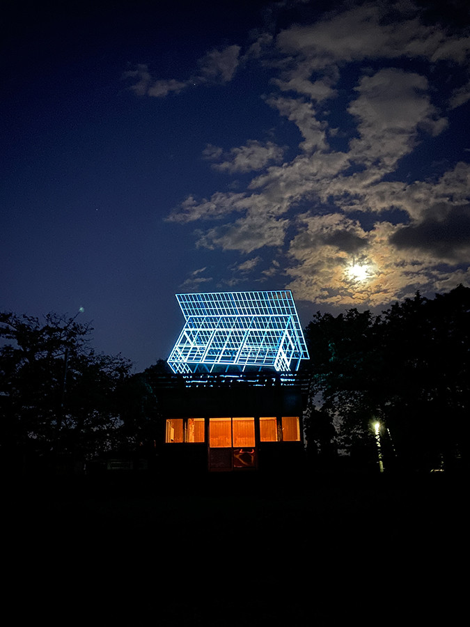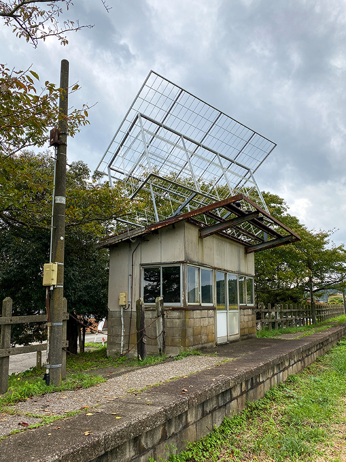 こちらも、旧のと鉄道に展示された作品。旧上戸駅の駅舎のシルエットをなぞった骨組みの構造物が、駅舎の上部に角度を変えて重なっています。