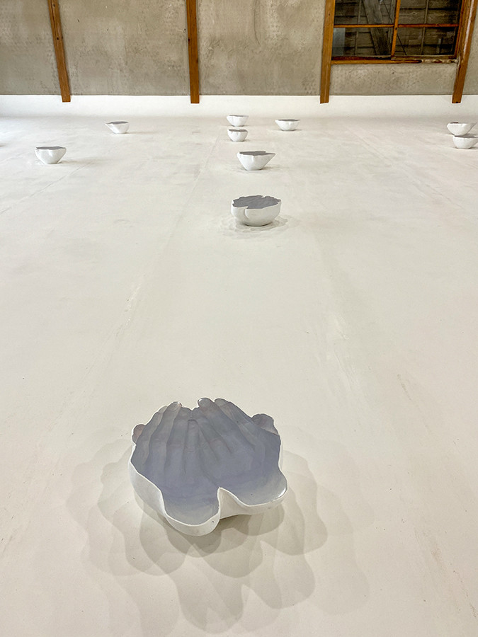 続いて、漆喰が塗られた真っ白な床に並ぶ、小さなオブジェ。水をすくう人の手をかたどったもので、手のモデルは作品周辺で暮らす人たちです。
