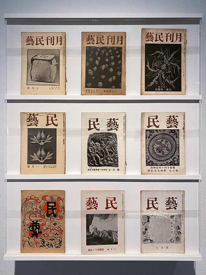 第5章「ローカル/ナショナル/インターナショナル 1930年代-1940年代」 5-9「民藝と戦争」 1940年~1944年に発行された『月刊民藝』『民藝』など 下段左側と中央の『民藝』のみ日本民藝館蔵、その他はすべて個人蔵