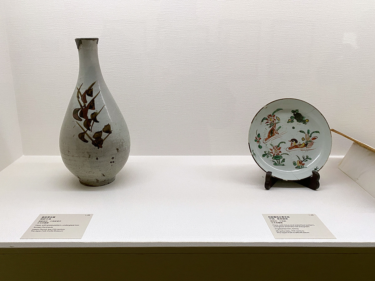 第1章「『民藝』前夜 ─ あつめる、つなぐ 1910年代-1920年代初頭」 1-3「『陶磁器の美』と初期コレクション」 (左から)《鉄砂草文瓶》朝鮮半島 朝鮮時代 17世紀後半 日本民藝館 / 《色絵蓮池水禽文皿》中国・景徳鎮窯 明時代 17世紀 日本民藝館