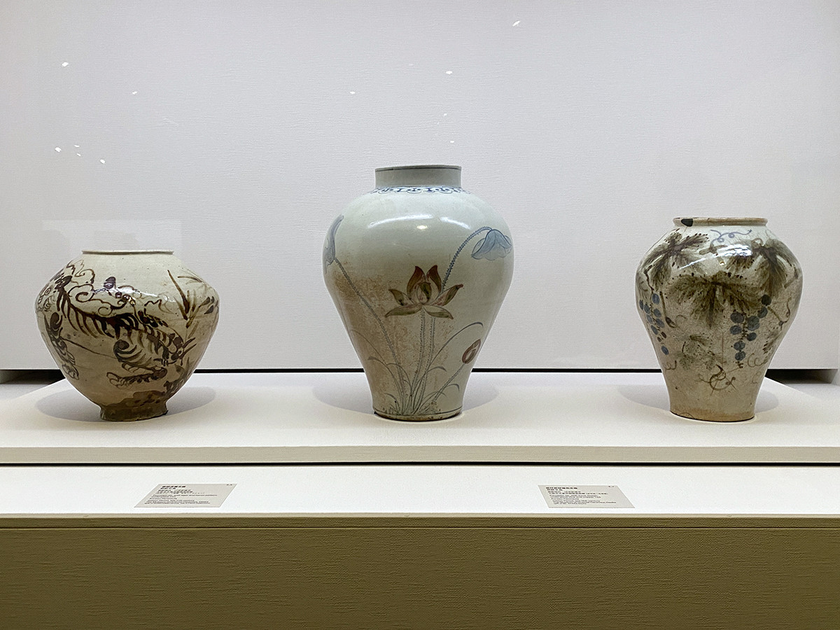 第2章「移動する身体─『民藝』の発見 1910年代後半-1920年代」 2-1「朝鮮の友へ」 (左から)《鉄砂虎鷺文壺》朝鮮半島 朝鮮時代 17世紀後半 大阪市立東洋陶磁美術館(住友グループ寄贈・安宅コレクション) / 《染付辰砂蓮花文壺》朝鮮半島 朝鮮時代 18世紀後半 大阪市立東洋陶磁美術館(安宅英一氏寄贈)/ 《染付鉄砂葡萄栗鼠文壺》朝鮮半島 朝鮮時代 17世紀末期~18世紀初頭 日本民藝館
