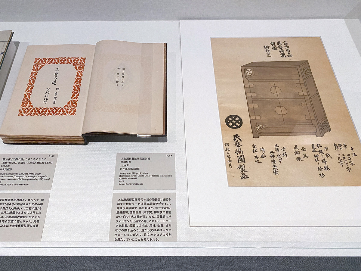 第3章「『民』なる趣味 ─ 都市/郷土 1920年代-1930年代」 3-6「新しい民藝をつくる」 (左から)《柳宗悦『工藝の道』ぐろりあそさえて》 [装幀:柳宗悦、表紙布:上加茂民藝協團考案布] 1928年 日本民藝館 / 《上加茂民藝協團関連図面》黒田辰秋 1928年 河井寛次郎記念館