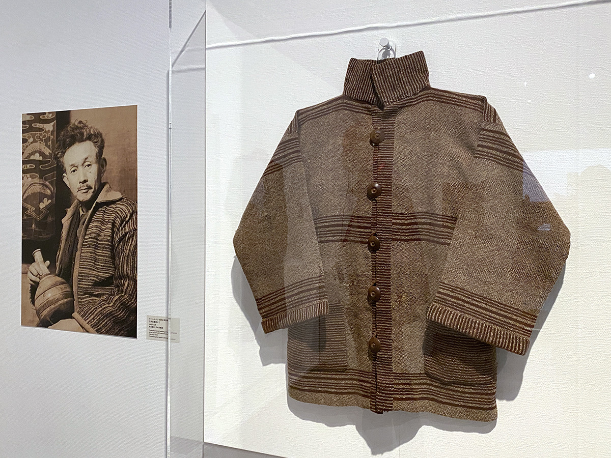 第4章「民藝は『編集』する 1930年代-1940年代」 4-2「歩くメディア ─ 民藝と衣服」 (左から)ホームスパンを着る柳宗悦 日本民藝館にて 1948年2月 写真提供:日本民藝館 / 《茶地縞ジャケット(柳宗悦着用)》及川全三 岩手県盛岡市 昭和中期 日本民藝館