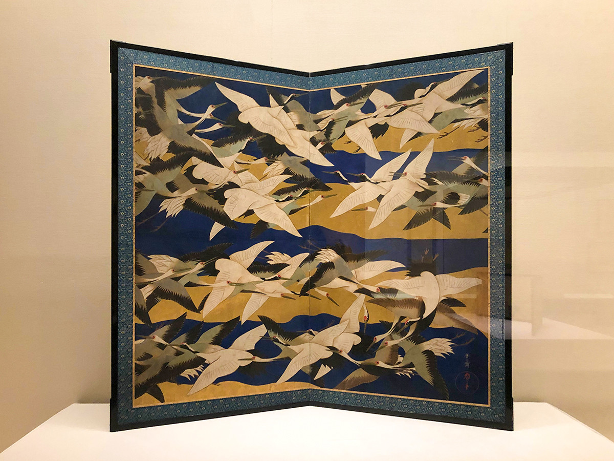 中でもインパクトを放つのは、鶴が飛び交う様子を描いた《群鶴図屏風》です。大胆に省略して描かれた丹頂鶴と敷き詰めるように並んだ鍋鶴に映える、群青と金箔の帯。意匠的な背景で描かれた、其一の最晩年の作品です。
