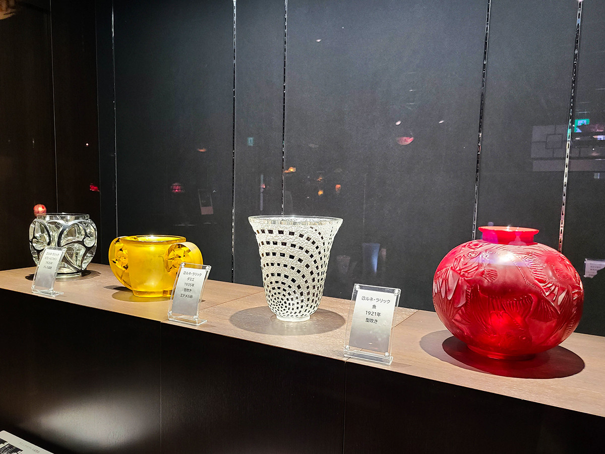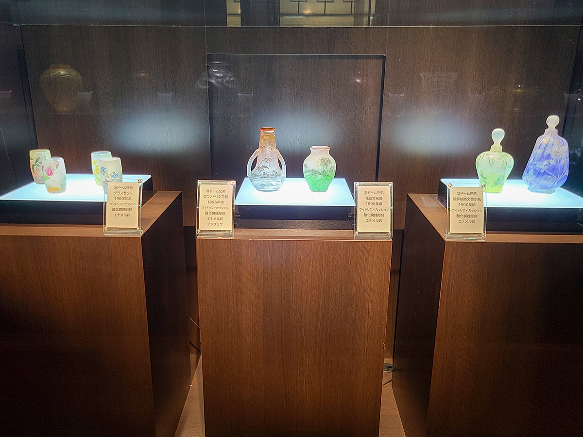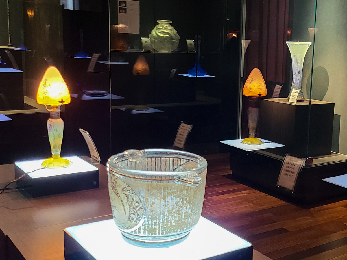 独立したガラスケース内の作品は非常に技術が高く彫刻のようです。手前の花器はアール・デコ時代のニーズにも柔軟に対応し制作していた様子が伺えます。
