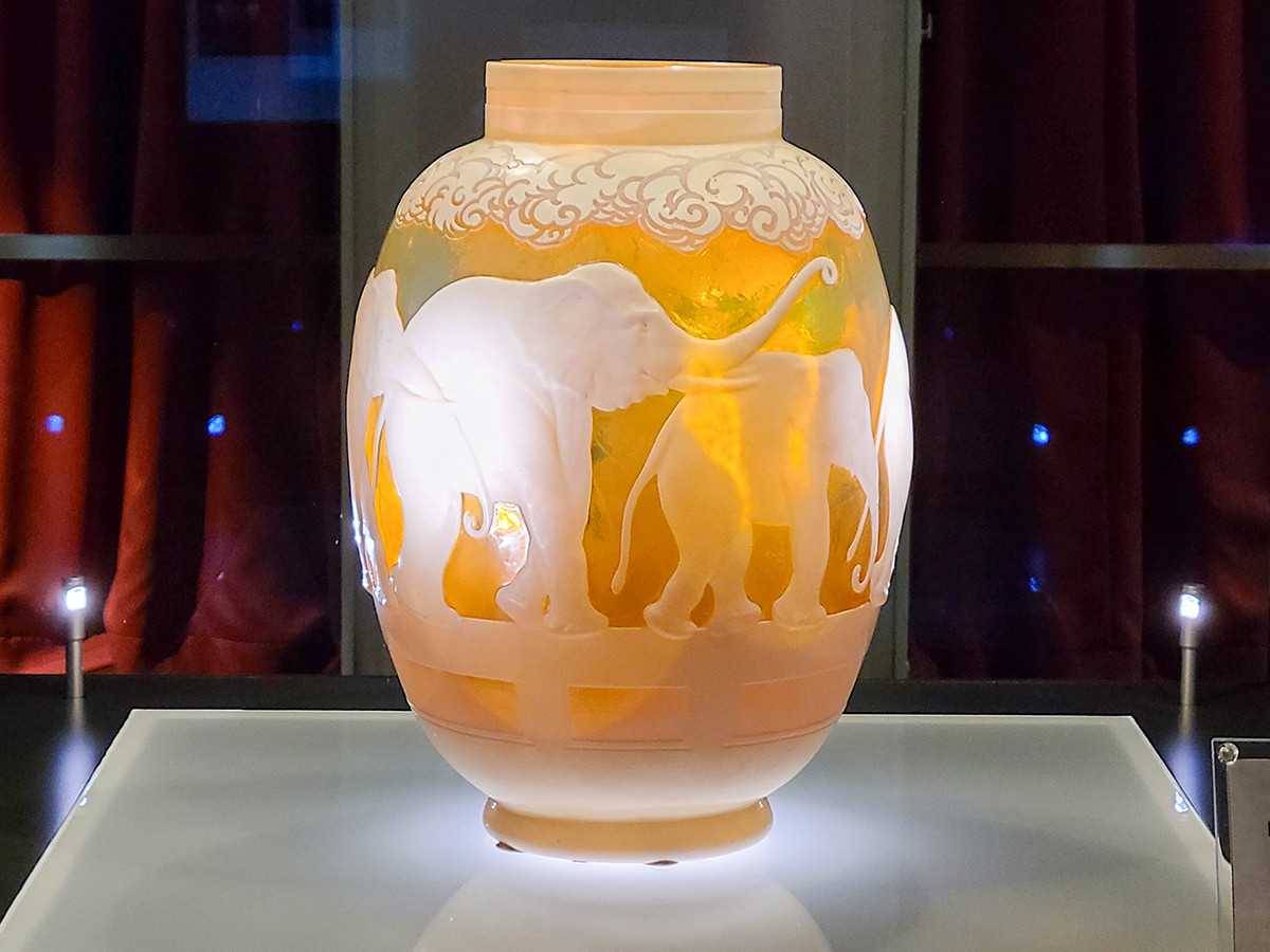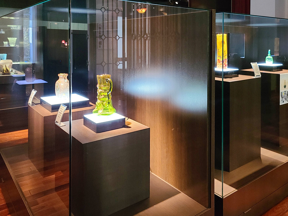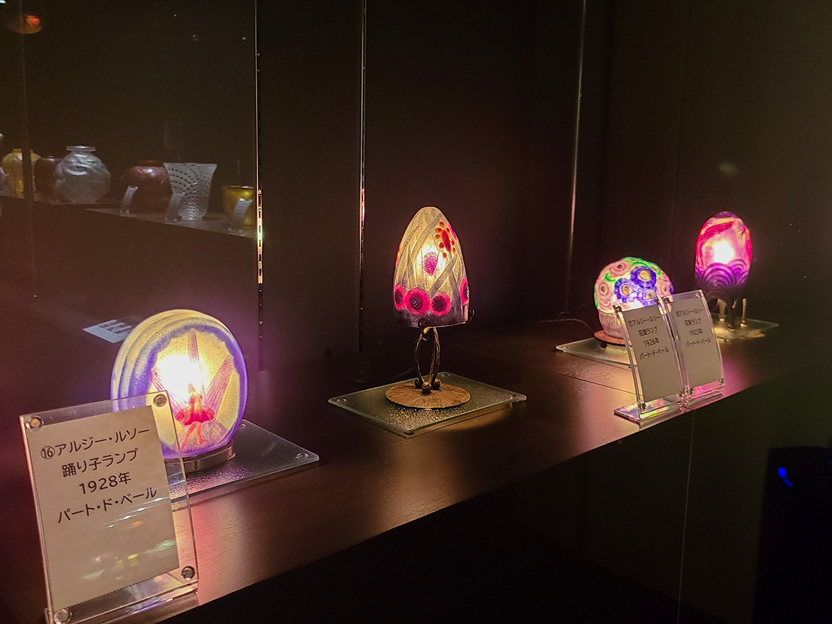 独立したガラスケース内の作品は非常に技術が高く彫刻のようです。手前の花器はアール・デコ時代のニーズにも柔軟に対応し制作していた様子が伺えます。