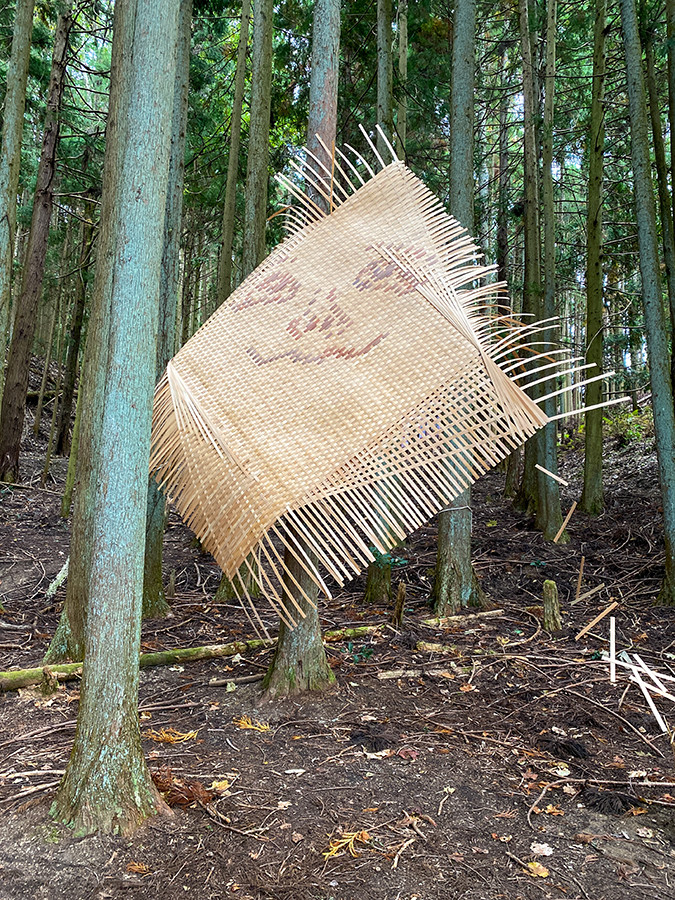 山の中には、大きな顔の作品。吉野の林業からの着想したものです。