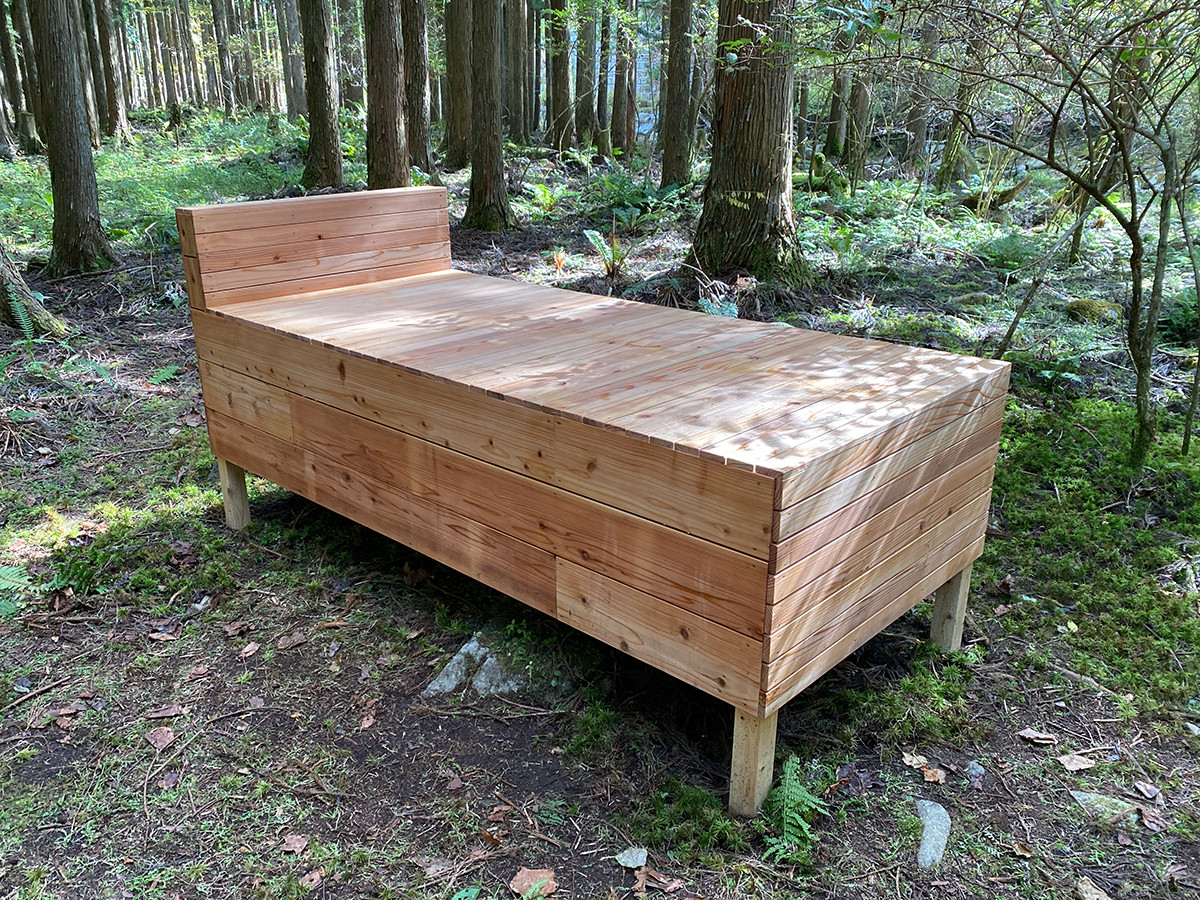 森の中にある木製ベッドの作品は、上に寝る事も可能です。仰向けに寝てみると、清流の音と木漏れ日に包まれました。
