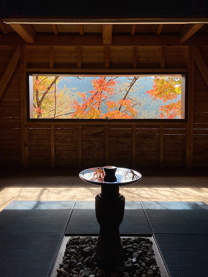 まず目にとまったのが、大原山展望台に設けられた作品。小屋の中央に水盤があり、水差しで水を注ぎながら水盤に映る景色の変化を楽しみます。