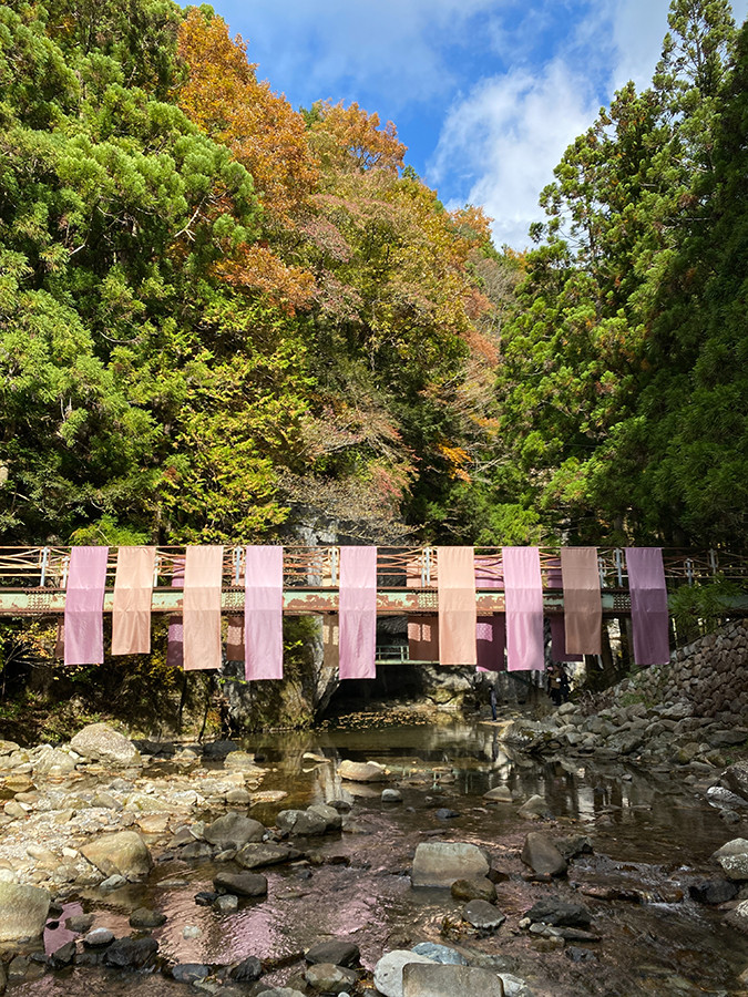 清流にかかる橋にあった布の作品を手掛けたのも、先ほどと同じ上野千蔵です。上野はCMなどで活躍している映像作家・撮影監督で、美術家ではないにも関わらず、芸術祭への取り組みは見事です。
