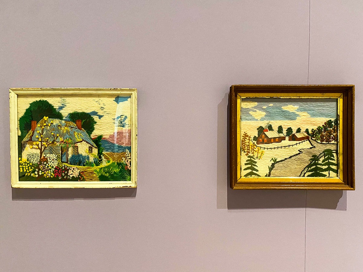 刺繍絵(左から)《海のコテージ》 / 《冬の湖》1941年(81歳) 個人蔵(ギャラリー・セント・エティエンヌ、ニューヨーク寄託)