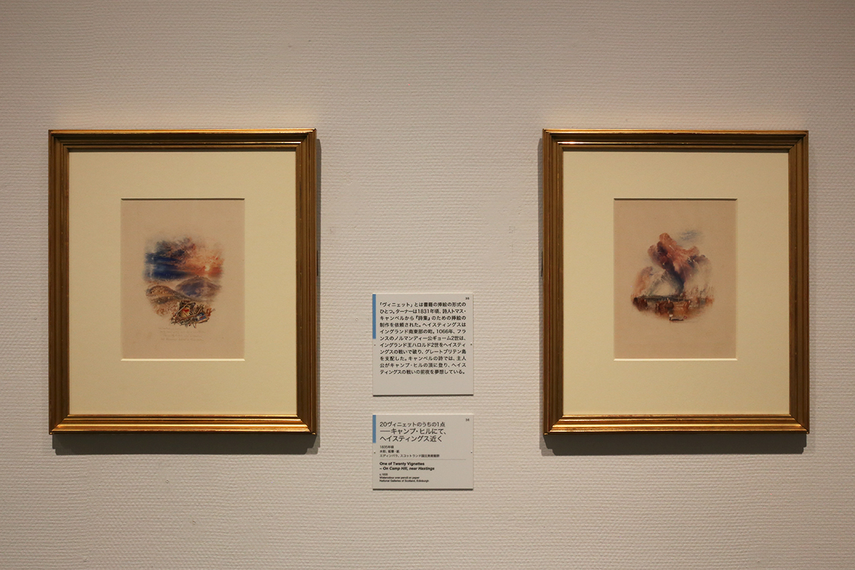 (左から)《20ヴィニェットのうちの1点―キャンプ・ヒルにて、ヘイスティングス近く》1835年頃 エディンバラ、スコットランド国立美術館群 / 《20ヴィニェットのうちの1点―バルト海の戦い》1835年頃 エディンバラ、スコットランド国立美術館群
