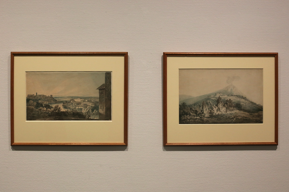 (左から)《ローマ 左岸にアヴェンティーノの丘のあるテヴェレ川》1794-97年 エディンバラ、スコットランド国立美術館群 / 《ヴェスヴィオ山とサン・サルヴァトーレ修道院》1794-97年 エディンバラ、スコットランド国立美術館群