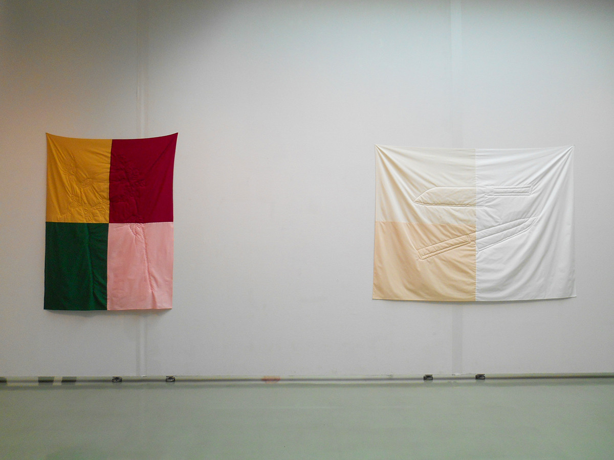 会場風景 本山ゆかり《ghost in the cloth(二本の薔薇)》2021年(左)、《ghost in the cloth(ナイフ)》2021年(右)