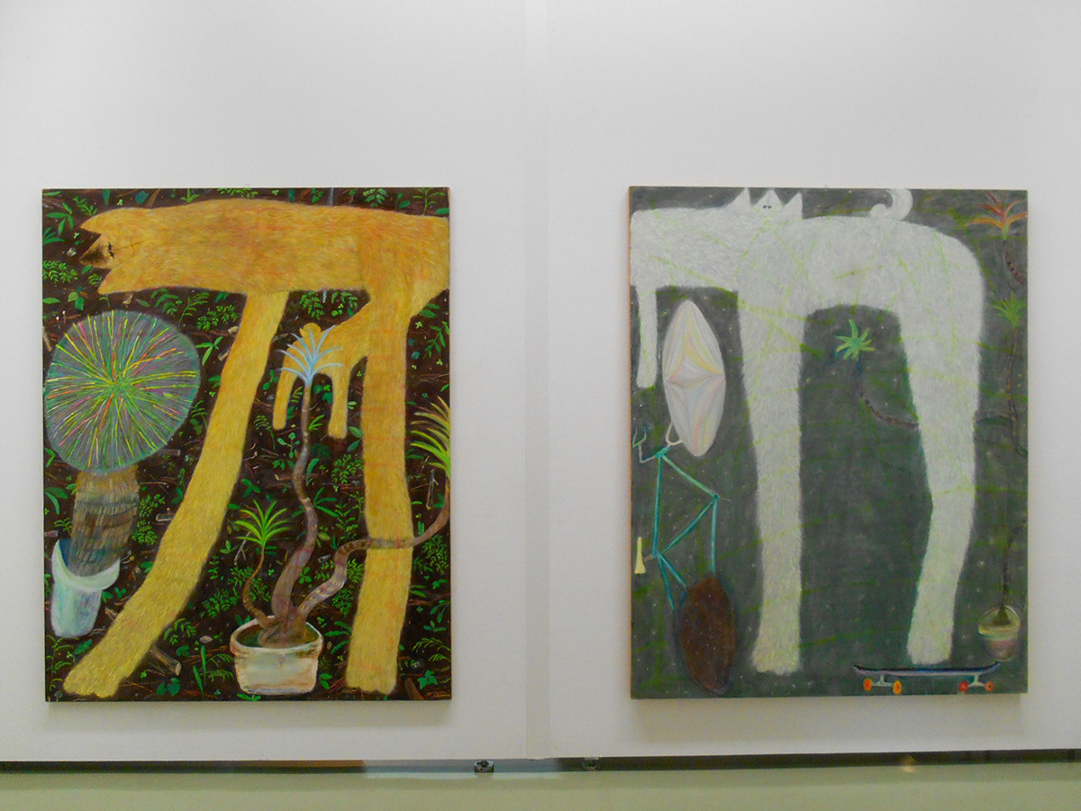会場風景 川角岳大《front dog》2019年(左)、《rear dog》2019年(右)