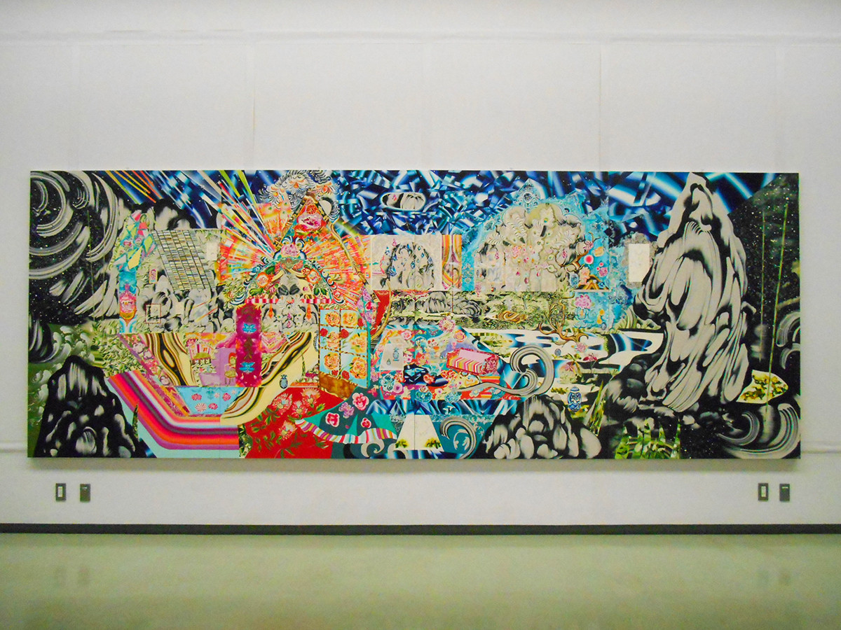 本展のチラシに使われている作品は、横幅が5mを超える大作ですが、その画面には、よくわからないもの、花、ソファ、ガラス瓶、岩場などが、びっしりと描かれています。カラフルで、遠目からも目立ちますが、近寄ると、その細やかな筆遣いに驚かされます。見ても見ても、見切れない不思議な作品です。