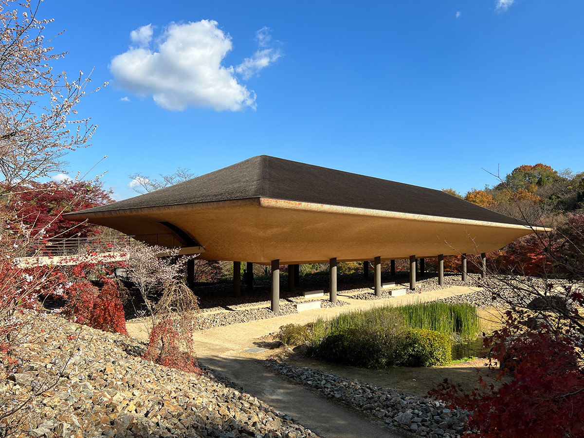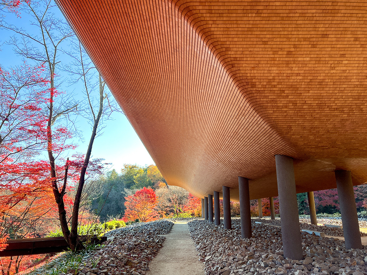 《洸庭》は伝統的なこけら葺きを応用し、全体をさわらの木材で柔らかく包んだ舟型の建物で、石のランドスケープ上に浮かぶように建っています。近づくと木の曲面が頭上に広がり、独特の作品世界に包まれます。