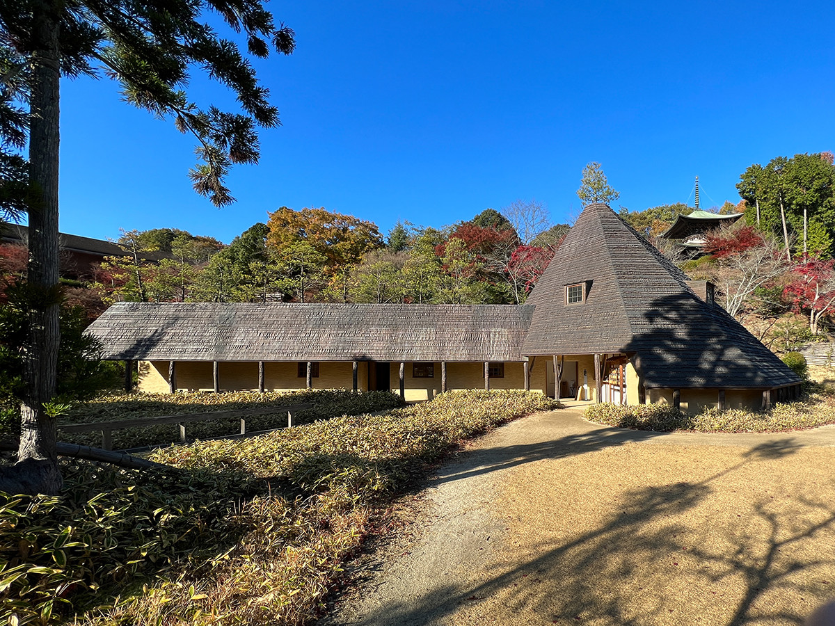豊かな自然の中に伽藍や茶室、庭園などが点在する神勝寺。総門から入るとさっそく目に入るユニークな建物は、藤森照信氏が設計した寺務所「松堂」です。