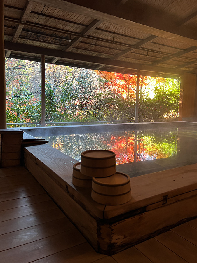 浴室もまた、修験道場に必須とされる七堂伽藍のひとつで、心と体の垢を落とすという重要な役割があります。木製の浴槽を備えた内湯からは、見事な景色が味わえます。