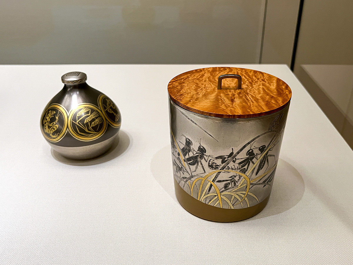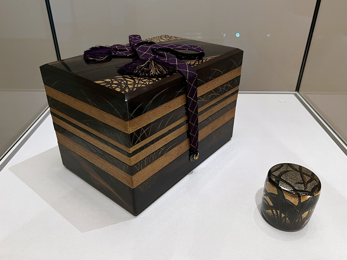 (左から)竹内碧外《秋草重文庫 むさしの》1980年頃 / 田口善国《ススキ蒔絵棗》1990年